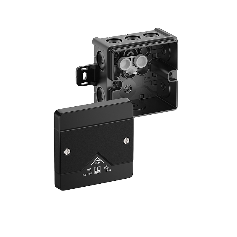 Junction box, protection class IP66, nominal cross-section 2.5 mm², certified by VDE (DIN EN 60670-1/-22 (VDE 0606-1/-22)), DLG (Ammonia resistance), self-sealing, soft insertion membranes, M16/M20, sealing range 4 - 16 mm, (1 rear, 8 side), external fixing lugs, for standard indoor and protected outdoor installations, black, Ui=1000 V AC, without terminals Dimensions: 87 x 87 x 52 mm
