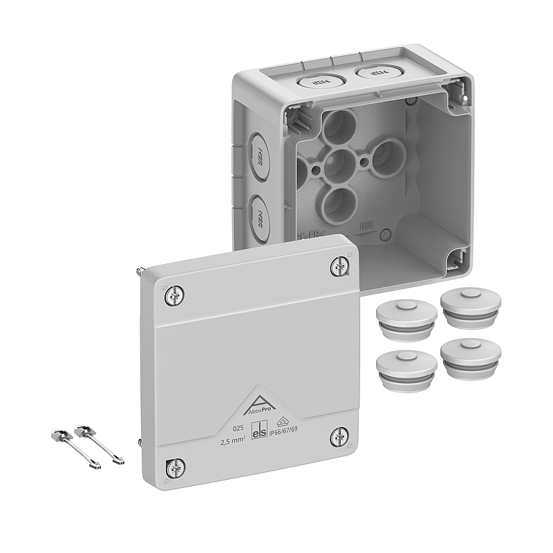 Junction box, protection class IP66/IP67/IP69, nominal cross-section 2.5 mm², certified by VDE (DIN EN 60670-1/-22 (VDE 0606-1/-22)), DLG (Ammonia resistance), DNV (Class: Ships and Offshore Installations), knockouts, M16/M20, (1 rear, 7 side), internal fixing points, for installation in industrial environments and unprotected outdoor areas, grey, Ui=1000 V AC, without terminals Dimensions: 92 x 92 x 60 mm Accessories supplied: 4 double membrane seals IP66 M20 sealing range 7 - 13 mm, cover retainer