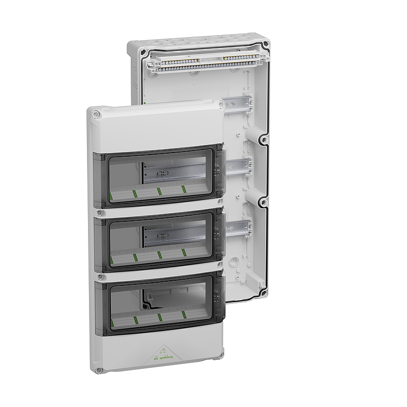 Small distributions boards, protection class IP65, 3 rows, 36 available modules, rated operational voltage: 400V AC, rated insulation voltage: 1000V AC, 1500V DC, above self-sealing, soft insertion membranes for tool-free cable insertion, below metric knockouts for universal cable insertions with cable glands and/or double membrane seals, for standard installations indoors