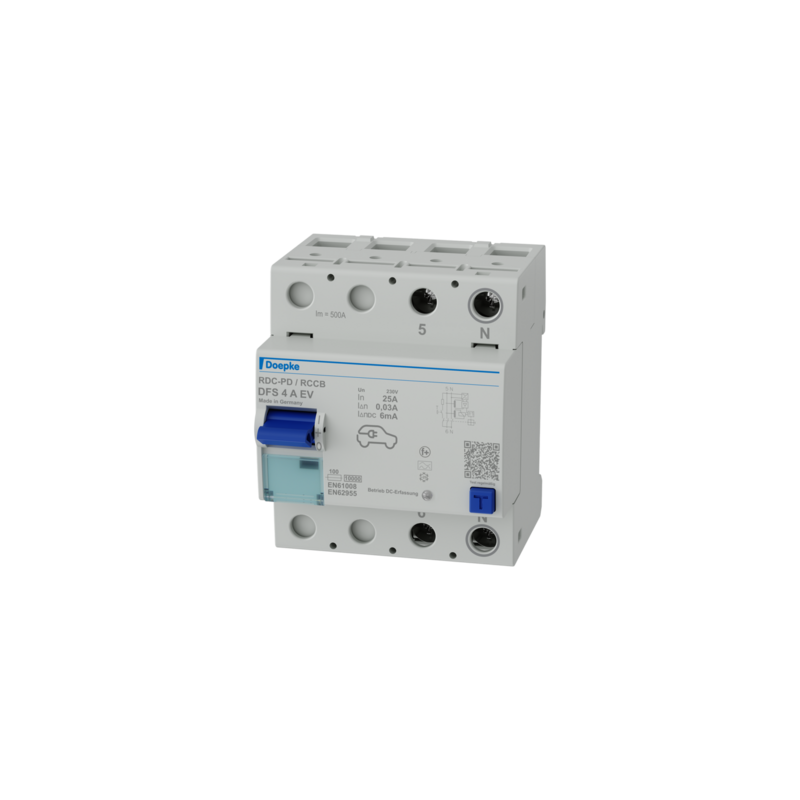 Type A residual current circuit-breakers detect pulsating direct current and alternating current. Our EV RCCB was specifically developed for use in charging stations for electric vehicles. The EV RCCBs detect smooth DC residual currents and safely trip at 6 mA DC. This protects upstream type A or F RCCBs and ensures maximum safety at your charging station.